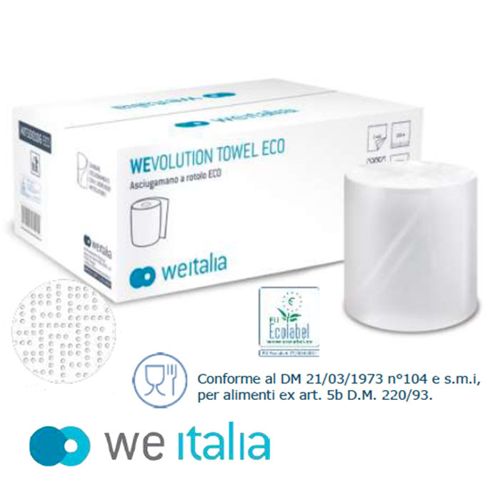 Asciugamano a rotolo a 2 veli -150 mt Materia prima: Fibre rigenerate – Certificazione: Ecolabel Conforme al DM 21/03/1973 n°104 e s.m.i, per alimenti ex art. 5b D.M. 220/93.