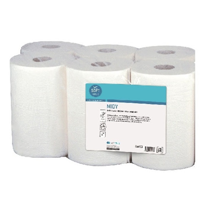 Rotoloni asciugatutto MIDY linea WEITALIA WESOFT, in pura cellulosa microgoffrata 2V, prodotto idoneo per il contatto con gli alimenti, certificato ISO E FSC.