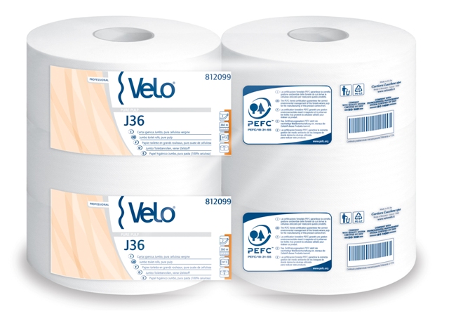 Carta igienica Jumbo 2 veli. Diametro rotolo 265 mm. Diametro foro anima 76 mm. Imballo da 6 rotoli da 360 mt. prezzo ( 1 ct da 6 rot)