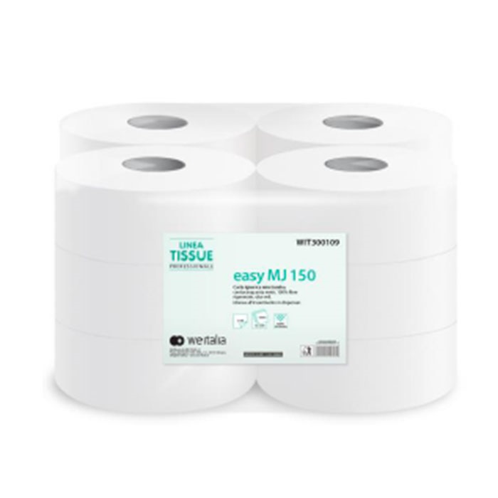 Carta igienica minijumbo Lucart 2 veli . Marchio We-Italia. Certificata ECOLABEL. Compatta, microgoffrata Prezzo per imballo da 12 rotoli da 150 metri. Peso collo 5,5 kg.