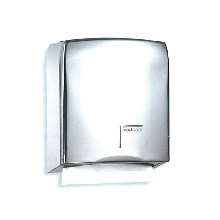 Distributore di asciugamani di carta in acciaio inox lucido AISI 304 spessore mm 0,8. Fissura di visualizzazione del contenuto sulla parte anteriore. Peso kg 1,8. Asciugamani 100 x 260 mm max. Dimensioni mm 330 x 133 profondità 133 mm.