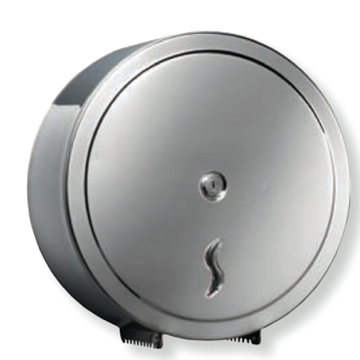 Acciaio Inox brillante o satinato, AISI 430 (17/10) o 304 (18/10), Ø Mandrino: 45 mm, Ø Rotolo: 230 mm max , Sobrio e robusto, Distribuzione della carta limitata dalla forma del mandrino. Viteria Inox inclusa. Dimensioni: A 265mm – L 260mm – P 127mm
