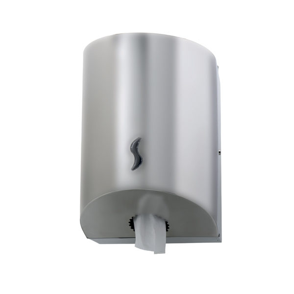Dispenser di carta a srotolamento centrale in acciaio inox. Finestra per il controllo del livello di carta. Completo di adattatore per carta pretagliata 110594. Dimensioni 370x260x270 mm.