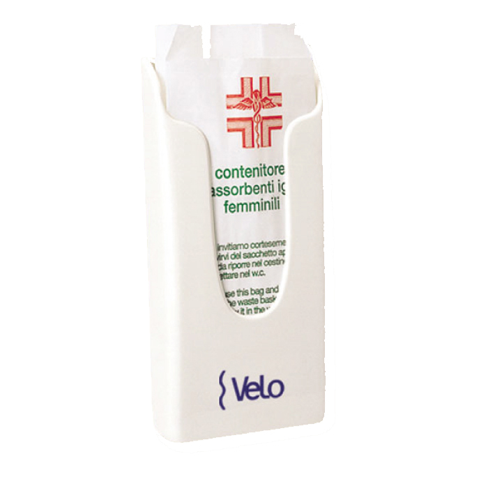 Dispenser per sacchetti assorbenti igienici per signora. Struttura in ABS. Dimensioni 285x135x45 mm.