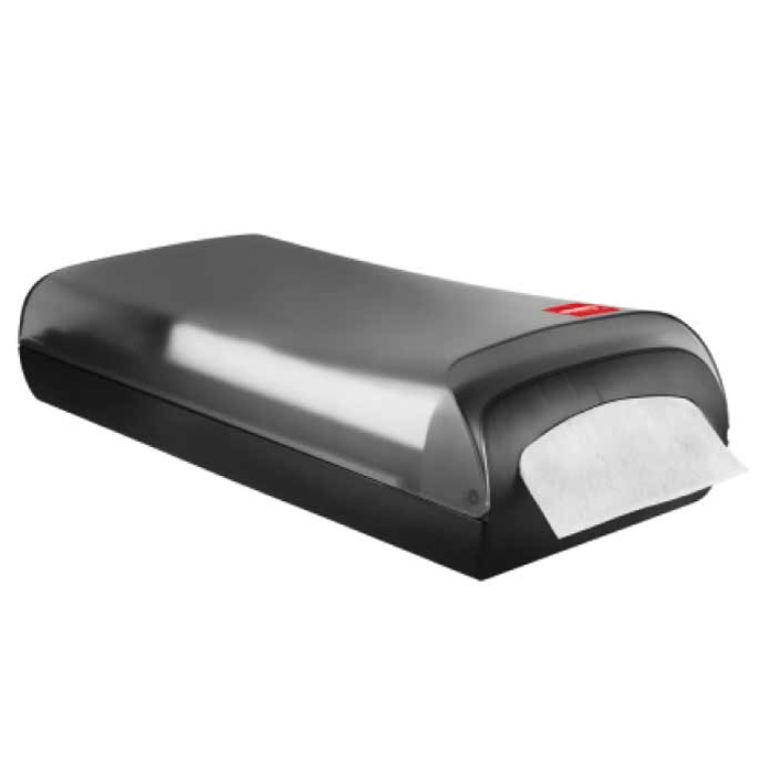 Sistema in ABS da banco o verticale da muro di dispensazione per tovaglioli intrercalati 2 veli. Chiusura a pulsante. Colore nero.. Contiene 525 tovaglioli di carta 2 veli 16,4×24. Dimensioni L 211 x H 113 x P 420 mm.