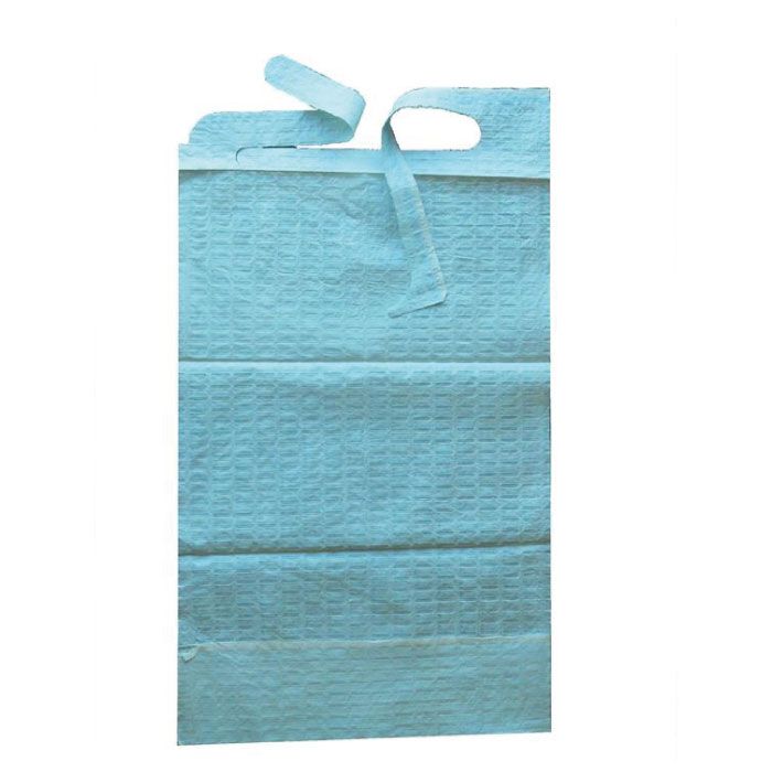Bavaglio politenato con tasca., cm 38×68 (tasca cm 10). Accoppiato carta/polietilene. Colore azzurro. Imballo da 10 conf. da 100 pz.