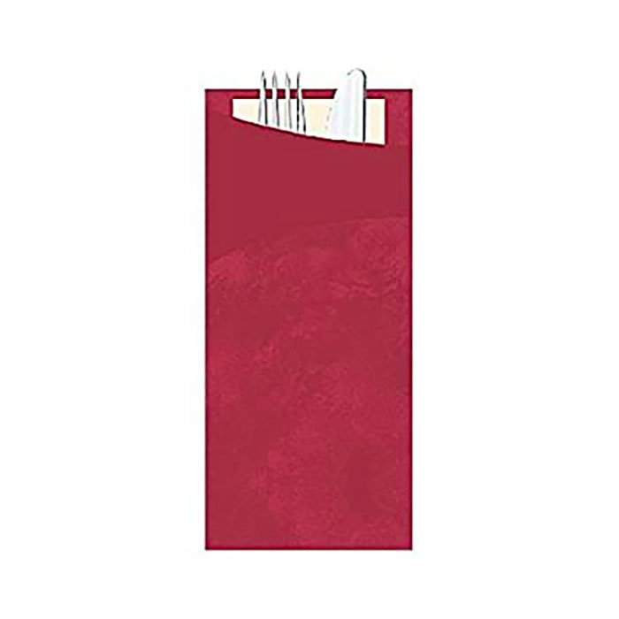 SACCHETTO CELLULOSA, 8,5 CM X 19 CM BORDEAUX CON TOVAGLOLO CREMA E POSATE (FORCHETTA E COLTELLO LIBRA)