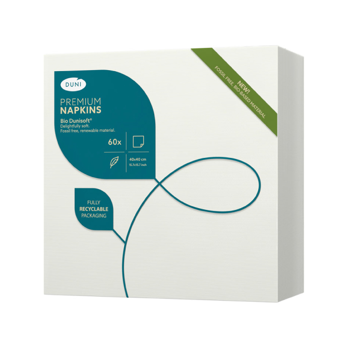 Tovagliolo Bio Dunisoft® 40 x 40 cm Bianco. Molto assorbente, dura per tutto il pasto. Rapporto ottimale costo-prestazioni per ambienti informali premium. Generosi per dimensioni, favoriscono il buonumore. Compostabile.