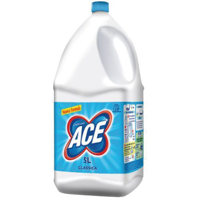 Candeggina ACE, PH 13.0 , non infiammabile, non esplosiva, non ossidante. Il prodotto per uso domestico può essere versato nello scarico dopo l’uso. PREZZO PER 1 TANICA – Imballo da 2