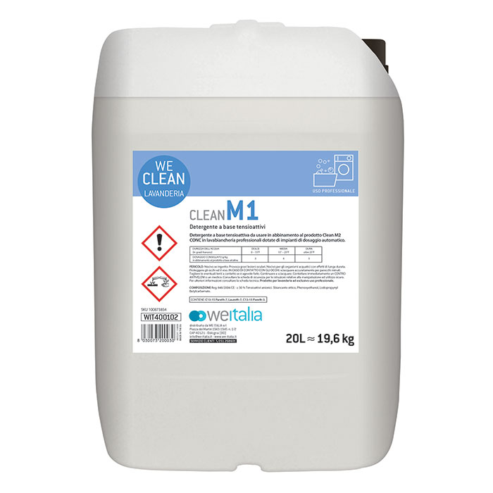Detergente neutro ad alta concentrazione a base di tensioattivi sintetici e naturali da utilizzare in combinazione con M2. – M1 può essere utilizzato su tutti i tessuti (cotone, sintetici e capi delicati). Grazie alla forte azione disperdente facilita la rimozione nonché l’allontanamento dello sporco. La presenza di sbiancanti ottici garantisce un ottimo punto di bianco. – Contiene saponi in grado di controllare la formazione della schiuma. Peso 19,6 kg. Produzione Diversey per We Italia.
