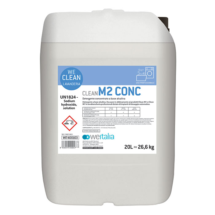 DETERGENTE LIQUIDO ALCALINO CONCENTRATO- LT 20 – KG 26,6 Detergente ad alta concentrazione di sostanze alcaline e sequestranti. Gli agenti sequestranti presenti nella formula ottimizzano il processo di lavaggio anche in presenza di acque estremamente dure, evitando l’ingrigimento della biancheria. L’elevata alcalinità di M2 innalza il pH della soluzione migliorando il processo di lavaggio. Produzione Diversey per We Italia.