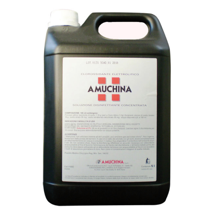 Clorossidante elettrolitico disinfettante per uso esterno, soluzione concentrata. Presidio Medico Chirurgico reg. n. 100/43 del Ministero della Sanità. Tanica da 5 litri.