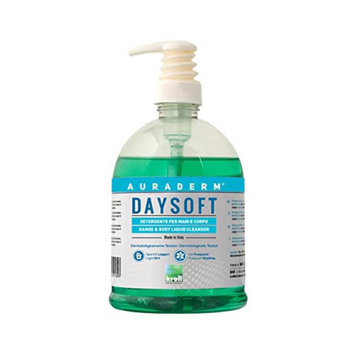 Detergente Dermolavamani liquido cremoso igienizzante per usi frequenti in confezione da 500 ml con dosatore.