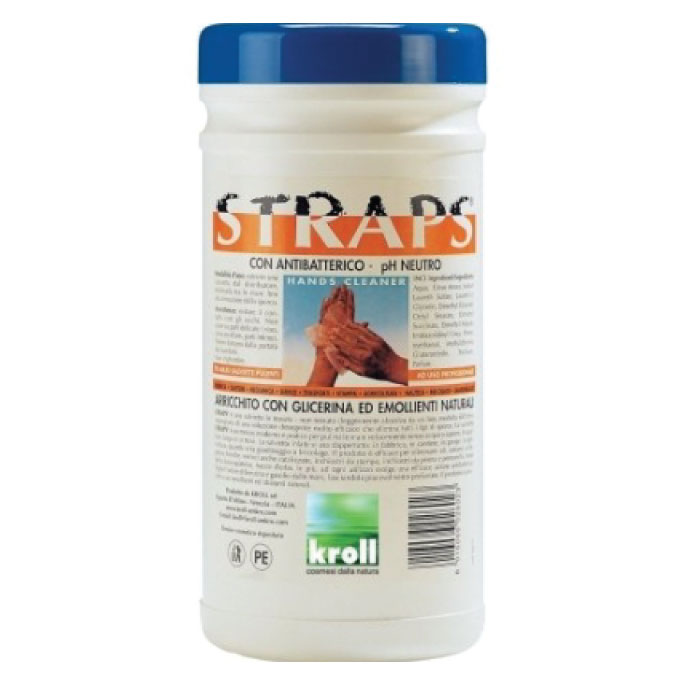 Salvietta detergente dermolavamani per sporchi tenaci senz’acqua, pH neutro con antibatterico. 70 salvietta in tessuto non tessuto, 20×30 cm. abrasive da un lato e morbida dell’altro, imbevuta di una soluzione detergente a base di tensioattivi di origine naturale vegetale che agisce in modo rapido ed in profondità. Il prodotto permette di rimuovere dalle mani oli, grasso, morchia, siliconi, vernici e cattivi odori senza bisogno d’acqua e in qualsiasi posto ci si trovi. Arricchito con principi attivi degli agrumi e glicerina. Contiene un principio attivo antibatterico.