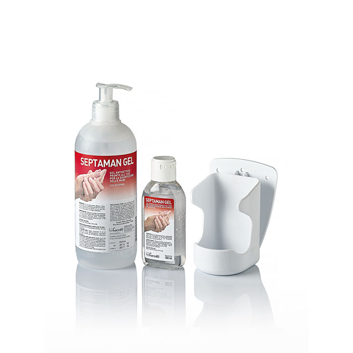 Presidio Medico Chirurgico. Gel disinfettante a base alcolica con emollienti per la disinfezione rapida di mani e cute. Attivo sui virus incluso virus H1N1. Confezione da ml 100 con erogatore.