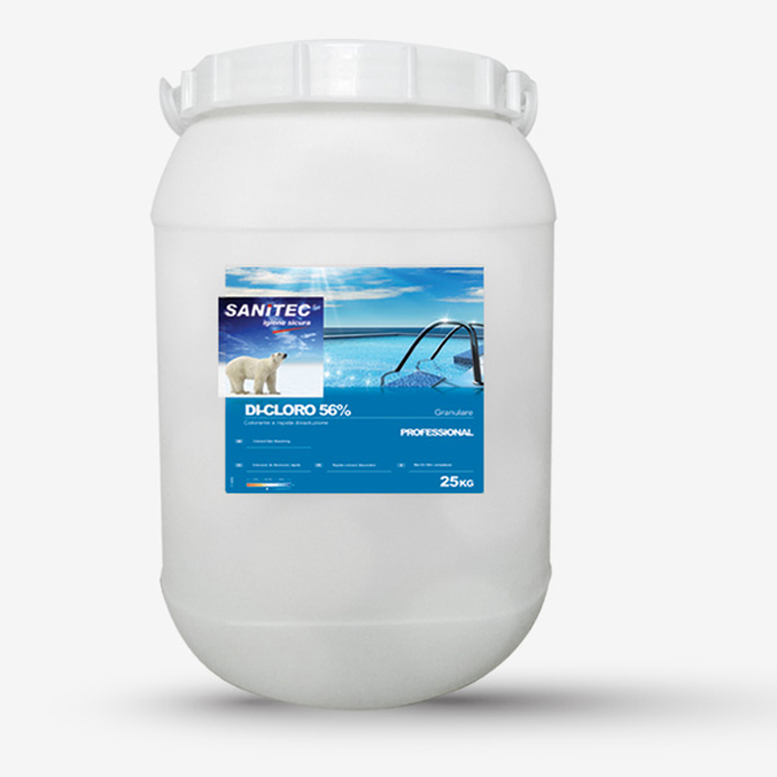 Programma per piscine. Lo stato fisico granulare rende l’uso ed il dosaggio del prodotto semplice e preciso sia con sistemi automatici che nei trattamenti manuali. Concentrazione 56%. Elevata durata allo stoccaggio. Imballo in confezione da 5 kg.