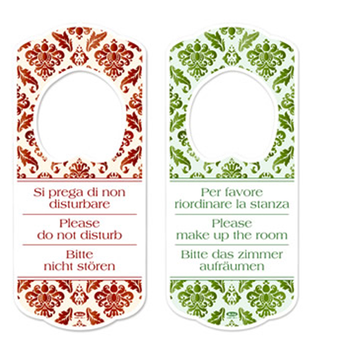Appendiporta “non disturbare” e “rifare la stanza” in cartoncino plastificato. In Lingua Italiano, Inglese, Tedesco. Lato verde “RIORDINARE LA STANZA” Lato rosso “NON DISTURBARE”