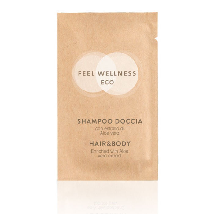 Linea WeItalia Feel Wellness. Bustina shampoo doccia da 10 ml linea “Cortesia Hotel”. Profumazione fiorita: Formato bustina mm 60×100. Prezzo (1 ct da 600 pz)