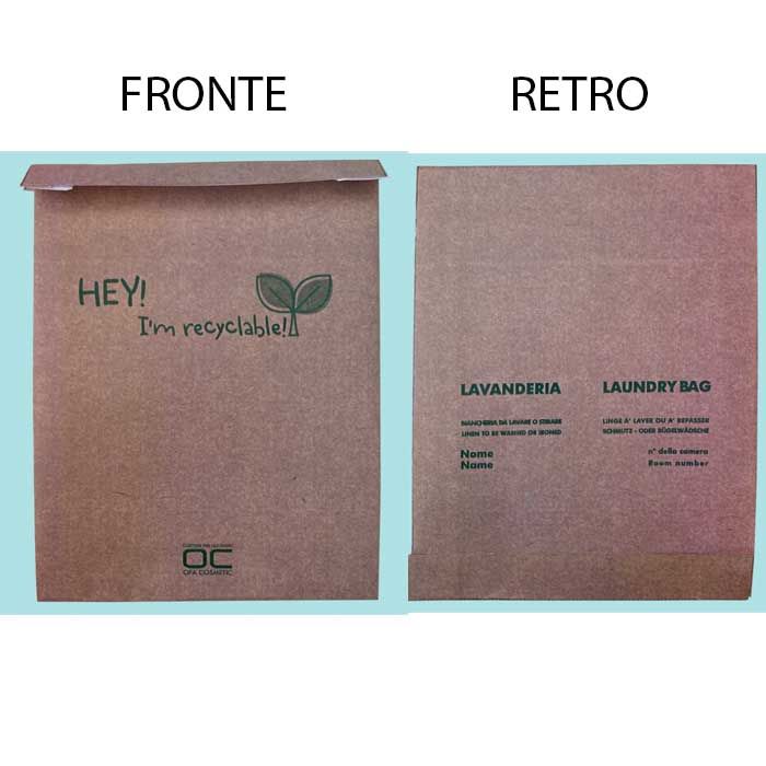 Sacco Biancheria in carta kraft avana con soffietto e chiusura con bi-adesivo, descrizione in 4 lingue, spazio per il nome dell’ospite e il numero della camera. Misura 35x10x44,5 + 5 cm Prezzo per cartone da 250 pz