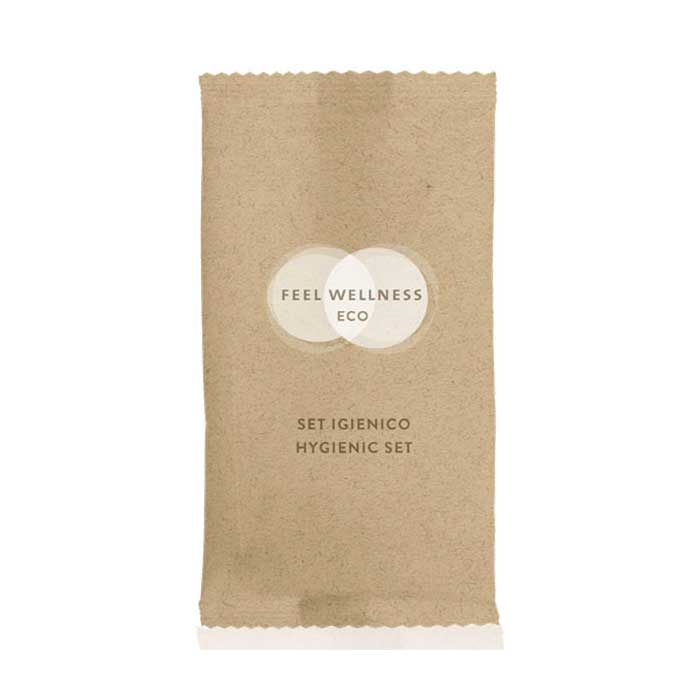 Set igienico contenente 3 dischetti di cotone, 4 cotton fioc con cartoncino in carta, in flow-pack in carta 100% riciclata – Linea “Feel Wellness Eco”