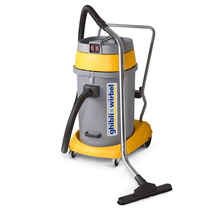 GHIBLI & WIRBEL: Aspirapolvere/Aspiraliquidi carrellato di grandi prestazioni. Dotato di tre motori. Possibilità di utilizzare un singolo motore, due o tre motori contemporaneamente. Dotato di un maniglione che consente il ribaltamento totale del fusto. Filtro nylon e distanziale portasacco opzionali. Filtri a cartuccia (normale e HEPA) opzionali.