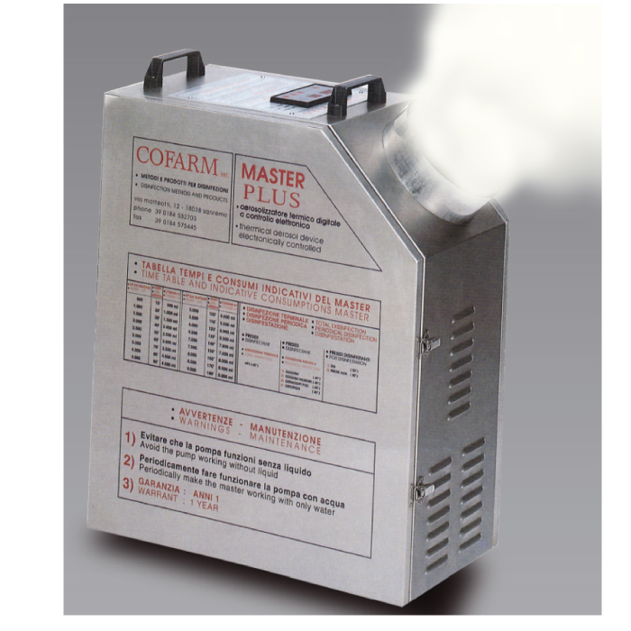 MASTER PLUS COFARM: Generatore di aerosol a secco per trattamento disinfettante in ambienti chiusi. Produce un aerosol “caldo” (a circa 40 gradi) che comunque non scalda apprezzabilmente l’ambiente. Motore 220 volt monofase 50/60 hertz. Sonda termica per controllo temperatura di lavoro dell’aerosol, pompa volumetrica in grafite e viton, consumi medi 50ml/min, peso a vuoto 30 kg, timer elettronico da 2 a 240 minuti, struttura in acciaio inox satinato, pannelo di comandi digitale.