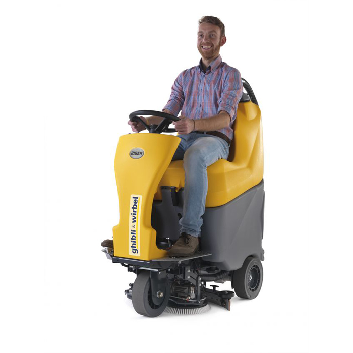 lavasciugapavimenti compatta GHIBLI RIDER R 65 FD BC uomo a bordo. Completamente meccanica per ridurre al massimo rischi di guasti e fermo macchina. Classica testata doppia spazzola da 55 cm, asciugatura di alto livello anche in curve strette, lavaggio filo muro a destra, estrema manovrabilità: gira in 152 cm. Bassa rumorosità, massima visibilità in tutte le direzioni, fino a tre ore di autonomia. COMPRESA DI BATTERIE AL GEL12V 105Ah E CARIBATTERIE 24V 20A, 4 SPAZZOLE CON 4 MOTORIDUTTOPRI DA 65 DI PISTA, PISTA DI ASCIUGATURA DA 75, TRAZIONE ANTERIORE.