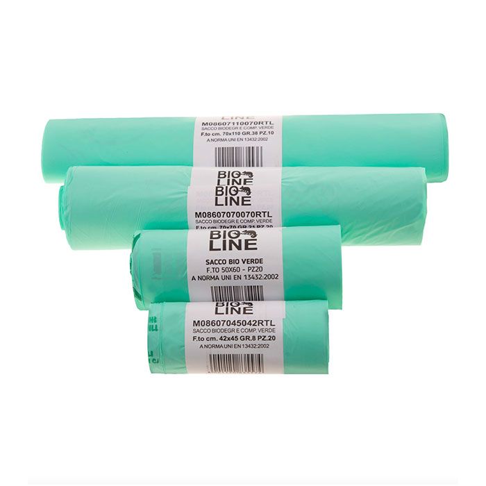 Sacchi biodegradabili e compostabili 90×120. peso 70 gr/cad/ca. Capacità 120 litri – my 25 – ( EN 13432:2002 con marchio TUV ). Prezzo per imballo da 10 cf da 10 pz (100 sacchi) Dimensioni Collo: cm 34×30 x h11