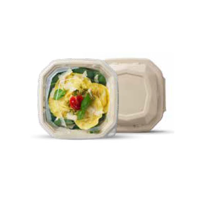 Contenitore in bagassa da 650 ml misura: 183 x 183 x 42 – Prezzo per 300 pz – CODICE coperchio in rpet: SFD188144 – Codice coperchio bagasse: SFD188149
