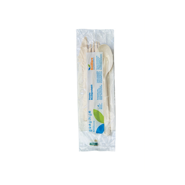 Linea BioWAre BIBO-HUHTAMAKI. Tris di posate biodegradabili in MATER-B confezionate in 500 pz imbustate insieme forchetta + coltello + cucchiao + tovagliolo