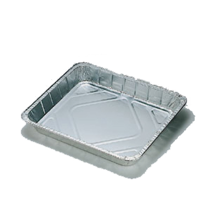Contenitori in alluminio rettangolari con bordo a G dim.ni sup. interne 368×308 altezza 50 mm. Può contenere 5.000 cc. – 12 Porzioni – Imballo da 3 conf.