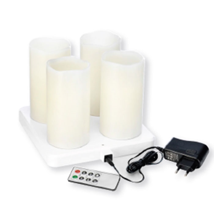 Kit di 4 candele LED pillar 220×75 mm Bianco “caldo” in plastica, per l’esterno. La “fiamma” tremolante dura 12 ore. Resistente all’acqua e al sole. Tempo di ricarica 6 ore, dotato di base caricabatterie e telecomando attivazione. Prezzo per imballo da 4 candele con kit di ricarica.