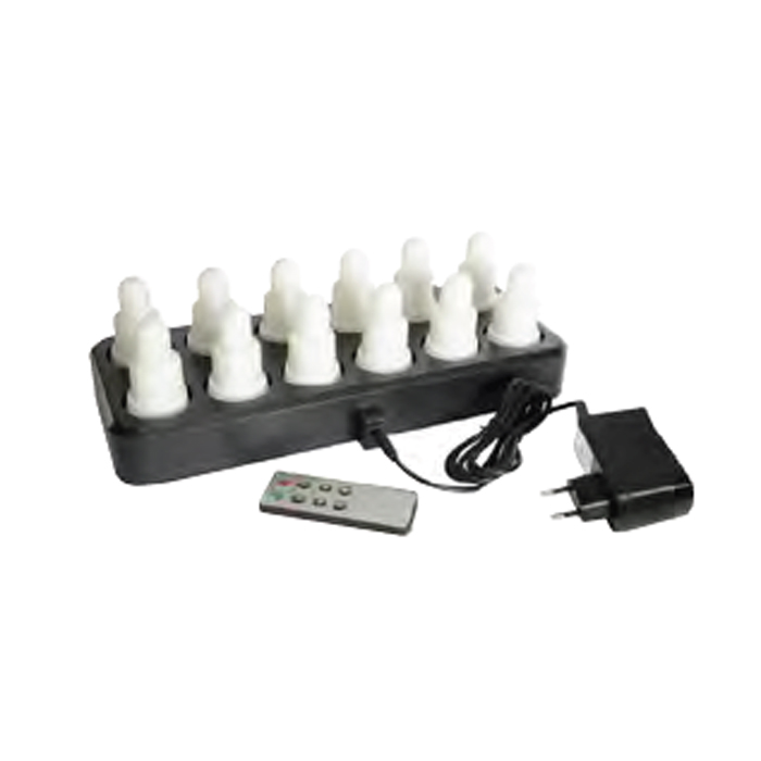 Candele a LED, prezzo per imballo da 12 pezzi. Tempo di ricarica 8 ore, durata 12 ore, 1 base di ricarica, 1 adattatore e 1 telecomando .Non smaltire nei rifiuti domestici. Attenersi alle normative locali sul riciclaggio di prodotti elettronici e batterie. Colori luce MULTICOLORE.
