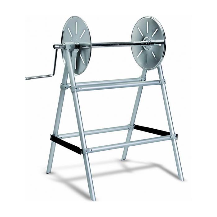 Rullo avvolgicima in acciaio inox con cavalletto in lega leggera per stabilimenti balneari. Capacità tamburo circa mt. 200 cima Ø mm. 8. Altezza mm. 690, larghezza tamburo mm. 430, Ø mm. 270