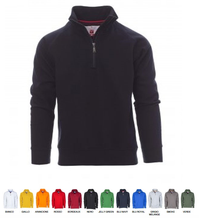 Felpa da uomo, mezza zip in tinta, in plastica con cursore in metallo, manica raglan, polsini e vita in costina elasticizzata, cuciture rinforzate. Composizione 70% COTONE + 30% POLIESTERE Aspetto GARZATA Colori vari. Peso 300 GR/MQ Taglie XS-S-M-L-XL-XXL-3XL-4XL-5X. ATTENZIONE INSERIRE NELLE NOTE ORDINE LA TAGLIA E IL COLORE DESIDERATO.