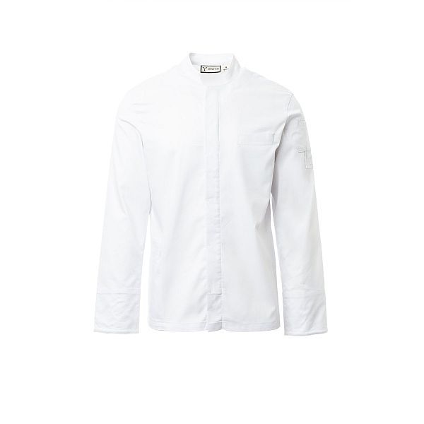 Giacca da cuoco con collo alla coreana, realizzata in twill di cotone e Lycra® T400®, con ottime proprietà elastiche e traspiranti. Chiusura centrale con bottoni automatici. Manica lunga con polsino risvoltabile, lunetta in tessuto a rete nel sotto giromanica, per agevolare la traspirazione. Iconica toppa sagomata sulla spalla sinistra, con ricamo ad elica tono su tono, provvista di taschino porta penne. Taschino al petto e pratica tasca porta smartphone in vita. Spacchi verticali nel fondoschiena per facilitare i movimenti.