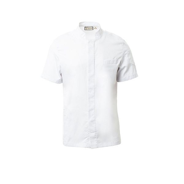 Giacca da cuoco con collo alla coreana, realizzata in twill di cotone e Lycra® T400®, con ottime proprietà elastiche e traspiranti. Chiusura centrale con bottoni automatici. Manica corta con orlo, lunetta in tessuto a rete nel sotto giromanica, per agevolare la traspirazione. Iconica toppa sagomata sulla spalla sinistra, con ricamo ad elica tono su tono, provvista di taschino porta penne. Taschino al petto e pratica tasca porta smartphone in vita. Spacchi verticali nel fondoschiena per facilitare i movimenti.