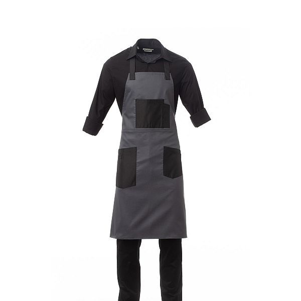 Grembiule unisex, multifunzione, con pettorina regolabile con bottoni sul retro collo, realizzato in twill di cotone e Lycra® T400®, con ottime proprietà elastiche e traspiranti. Presenta una tasca al petto e due in vita, provviste di sezioni diverse e passanti porta canovaccio. Tutte le tasche sono realizzate in tessuto Nylon Oxford 500D. Misure: 80x90cm.