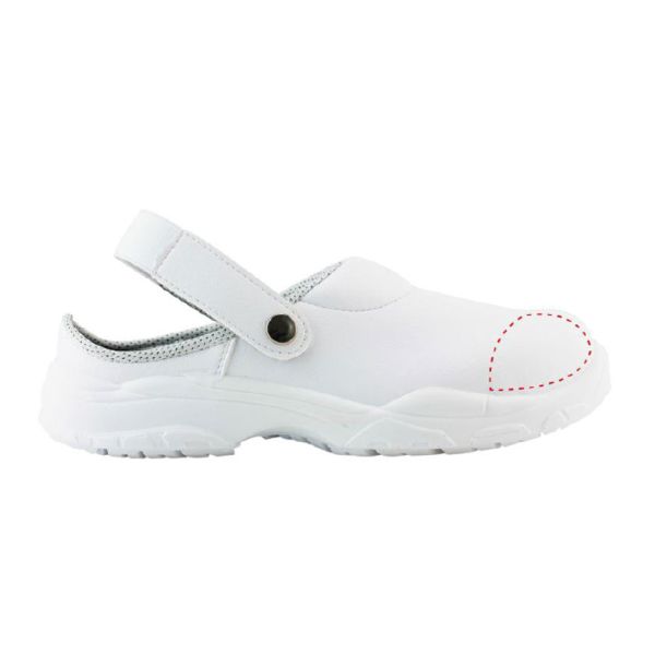 Calzatura tipo zoccolo certificata EN ISO 20345 : 2011- SB E A SRC -Calzatura in pelle sintetica con battistrada antiscivolo in poliuretano. Composta da: Tomaia in Microfibra traspirante; Fodera in Tessuto traspirante,antibatterico e resistenteall?abrasione; Sottopiede removibile,anatomico, traspirante, antimicotico e defaticante; Suola in PU compatto antiabrasione, antiolio, antiscivolo certificato SRC, antistatico. Puntale in composito (versione /S), resistente a oli e idrocarburi – 200J. Tacco h=3,5 cm. Peso medio 300 Grammi