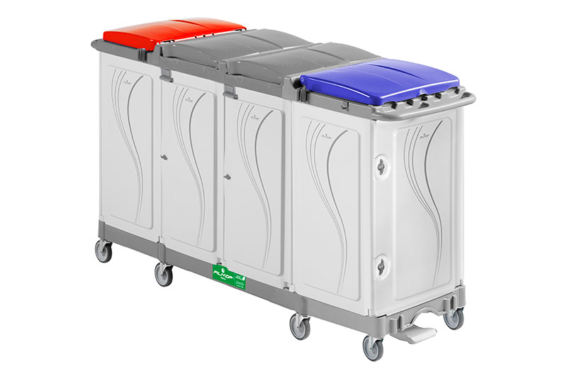 Carrello “ALPHA 0901008” certificato “Plastica Seconda Vita” (PSV) composto da base grande con ruote ø 100 mm, 2 montanti asimmetrici, montante simmetrico, 2 appendici con ruote, 2 portasacco lt. 150, 4 ganci portamanico, 2 ganci portapaletta, 4 divisori, 2 portasacco centrali lt.150, 6 parete laterali fisse, 2 antine di chiusura per portasacco, 2 antine laterali di chiusura, 2 coperchi con tabella porta-note per portasacco laterale, 2 coperchi per portasacco centrale, 8 pistoncini per chiusura ammortizzata e 2 set tappi a “T” chiusura montanti.