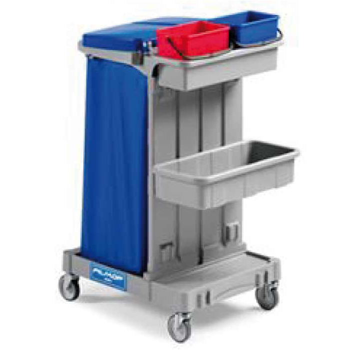 carrello multiuso alpha 1101 con ruote da 100 mm, portasacco 120 lt. completo di vaschetta, con 2 ganci portamanico e 2 ganci portapaletta, 1 vaschetta laterale cm 54x27x12. completano 2 secchi da 4 lt. blu e rosso. 75x58x111