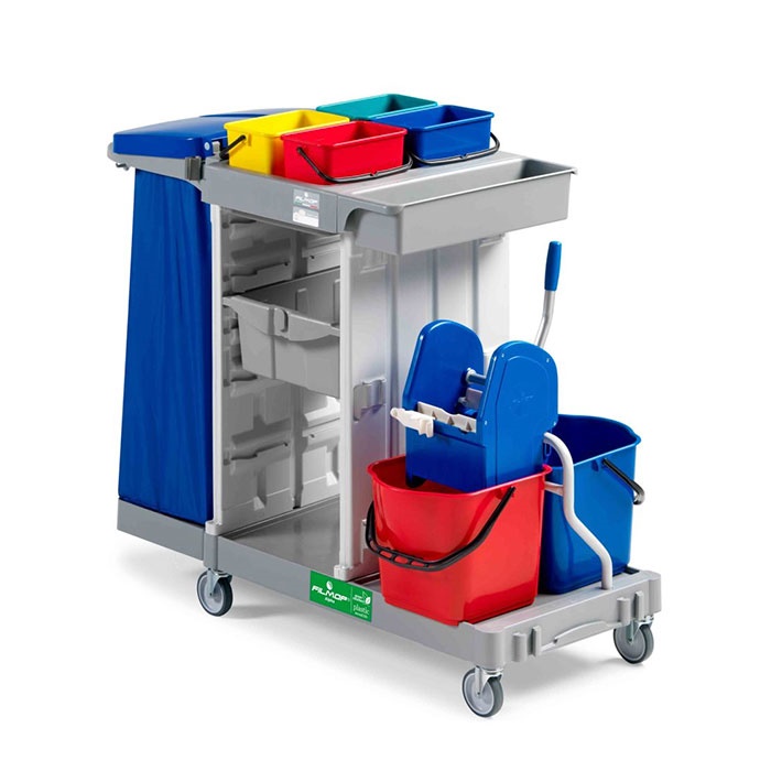 FILMOP. Ideale per ambienti dove è necessario l’occorrente per le operazioni di spolvero, raccolta rifiuti, lavaggio pavimenti e superfici, tutto in un carrello.