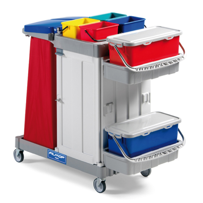 carrello con ruote da 125 mm, 2 montanti asimmetrici, portasacco lt. 120 con 2 ganci portamanico e 2 ganci portapaletta, divisorio lt.40+80, vaschetta centrale, profilo di chiusura per vaschetta, 4 secchi da lt. 4, set pittogrammi adesivi, 2 vaschette laterali, 2 secchi top-down da lt.20, parete laterale fissa, antina laterale di chiusura, cassetto scorrevole. dimensioni: cm 118x58x114