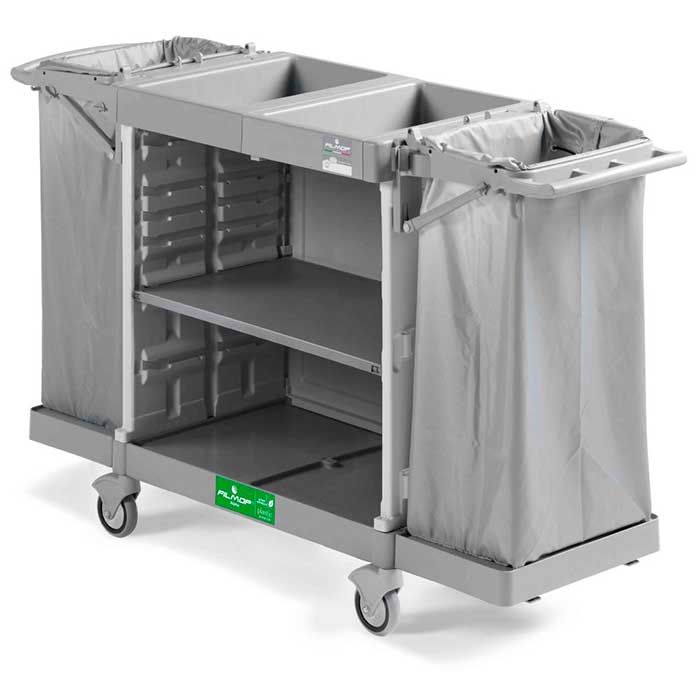 Carrello di servizio con 2 portasacco + vaschette + ripiano grande per il trasporto della biancheria pulita e la raccolta della biancheria sporca negli hotel, nelle collettività e nelle comunità. Realizzato in conformità alla norma UNI EN ISO 14067:2018, ecosotenibile realizzato con con materiali separabili e quindi riciclabile a fine vita. Leggero, resistente agli urti, all’uso frequente e alle basse temperature. Robusto, compatto, ergonomico, modulare, facile da montare e da pulire. Il sacco portabiancheria è sempre separato dal resto del carrello. Montanti dotati di attacchi per applicazione di vaschette laterali, può sostenere un peso fino a 30 kg.