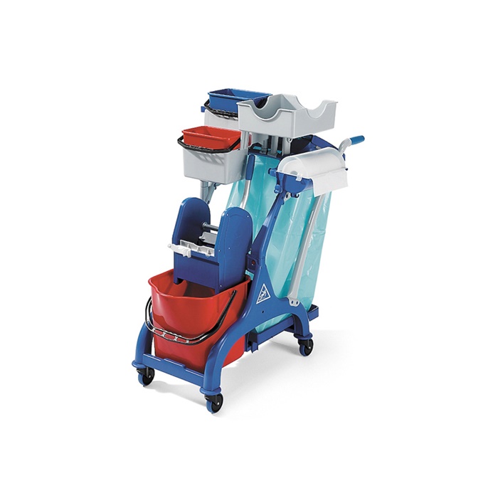 Carrello “ARKA 33” in plastica lt. 25 composto da telaio con ruote Ø 80 mm con paracolpi , impugnatura ad “U” strizzatore Regular, secchio lt. 25, manubrio con rinforzi, portasacco lt. 100 con rinforzi e coperchio, piatto reggisacco, portasecchi con supporti, supporto grande per portasecchi, 2 secchi lt.4, reggicassetta o portasecchi con supporti, set portacarta con coperchio e 3 ganci, gancio portapaletta e gancio portamanico Flip. Ideale per ambienti medio-grandi che richiedono lo spolvero, la raccolta rifiuti e il lavaggio dei pavimenti e delle superfici