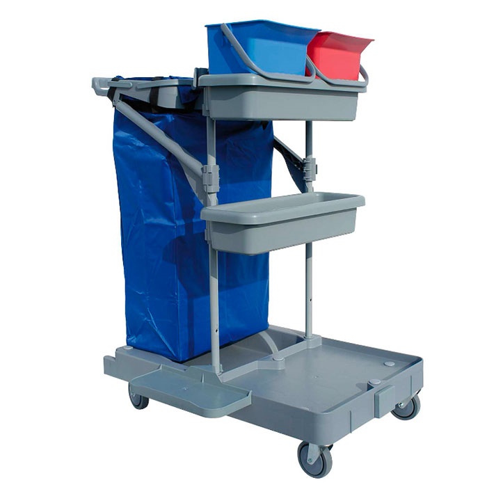 Base reggiscopa. Base in polipropilene con 4 ruote in metallo Ø 100 mm. Supporto in Rilsan con fori frontali. Supporto sacco da 120 l in polipropilene (completo di blocca sacco e supporti di rinforzo laterali). 2 vaschette in polipropilene. 2 secchi in polipropilene da 6 l. Portamanico. Supporto in fibra di vetro per accessori con giunto a coda di rondine. Supporto in fibra di vetro per accessori con doppio giunto a coda di rondine.