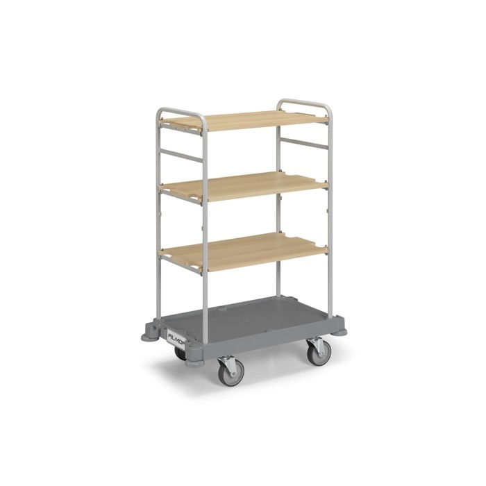Carrello di servizio “MORGAN HOTEL 600” composto da base piccola con ruote ø 125 mm, 2 montanti in Rilsan, 3 ripiani in legno cm. 72,5×46 cm. e 2 barre di rinforzo 68 cm. Carrello di servizio per il trasporto della biancheria pulita negli hotel, nelle collettività e nelle comunità. Realizzato con materiale riciclabile. Componenti in materiale anti ruggine. Carrello dotato di ruote ø 125 mm e battistrada da 35 mm. con flangia di fissaggio. Robusta base in plastica utilizzabile come quarto ripiano.
