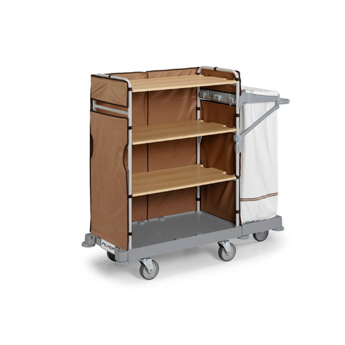 Carrello di servizio per il trasporto della biancheria pulita e la raccolta della biancheria sporca negli hotel e nelle comunità. Composto da base grande con ruote ø 125 mm, 2 montanti in Rilsan, 3 ripiani in legno cm. 85,5×46 cm, 2 barre di rinforzo cm. 81, schienale intero in tela plastificata e astina in acciaio inox cm.102,portasacco lt. 120 e piatto reggisacco con ruota ø 125 m.Realizzato con materiale riciclabile, Componenti in materiale anti ruggine, Robusta base in plastica utilizzabile come quarto ripiano, Possibilità di inserire una chiusura frontale in tela plastificata avvolgibile.
