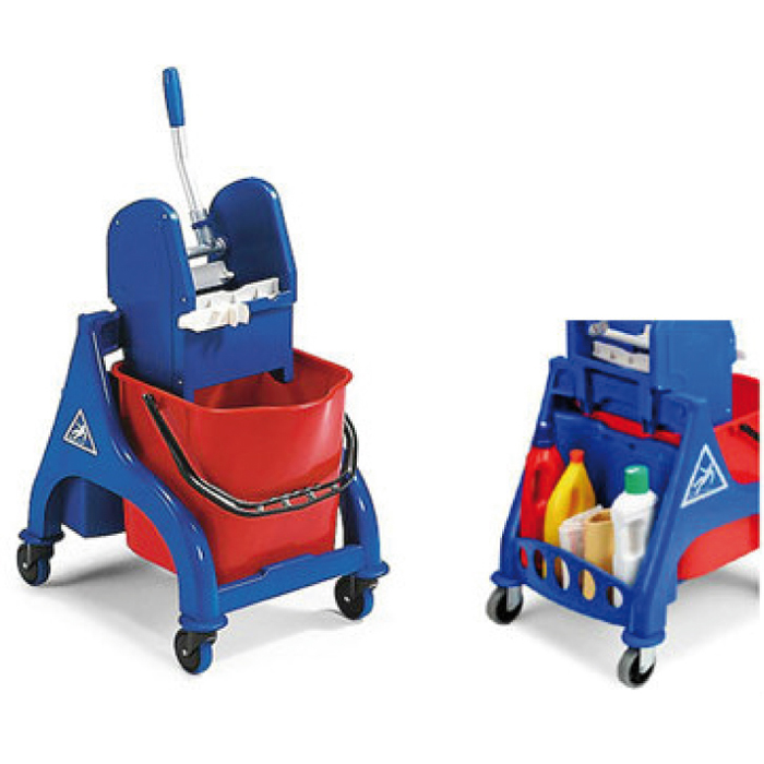 CARRELLO ORION in plastica composto da telaio, ruote da 80 mm con paracolpi , strizzatore regular e secchio da lt. 25. carrello utilizzato per il lavaggio pavimenti di ambienti medio/piccoli. comodo vano posteriore portaoggetti. dimensioni cm 53 x 42 x 90