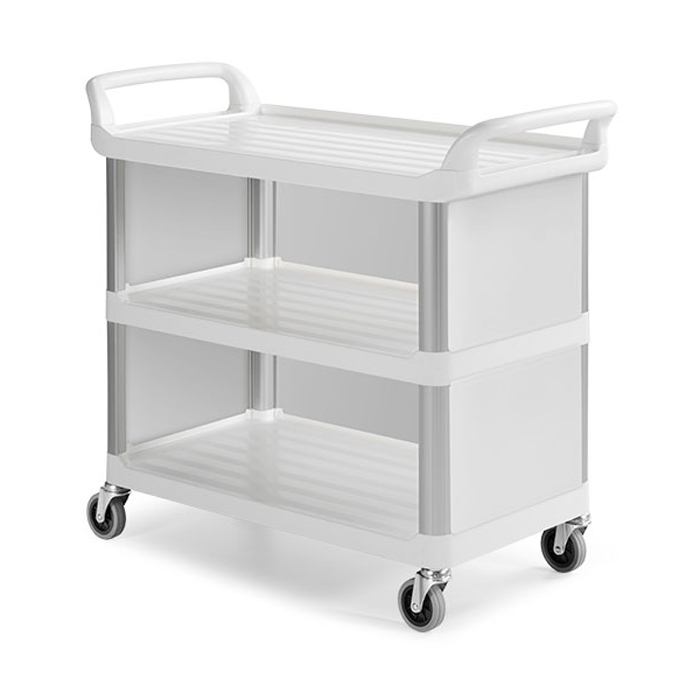 Carrello di servizio a 3 ripiani , versione completa di pareti di chiusura, con montanti in alluminio, ripiani/pareti in plastica, 2 impugnature per agevolare il trasporto, con ruote da 100 x 28 mm. portata 50 kg. per piano. ideale per il trasporto di oggetti vari nel settore della ristorazione e della sanità. Dimensioni l=50 cm p=111 cm h=102 cm.